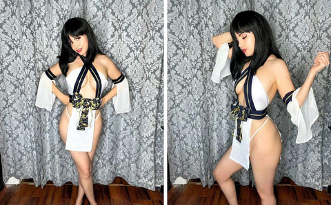 Design: Sexy anime lingerie featuring a criss-cross halter neckline with velcro closure, gold striped embroidery, open bust panel, sheer white draping fabric panels, a low open back, long mesh sleeves with slit openings, a big floral print bow at waist accents with velcro closure.