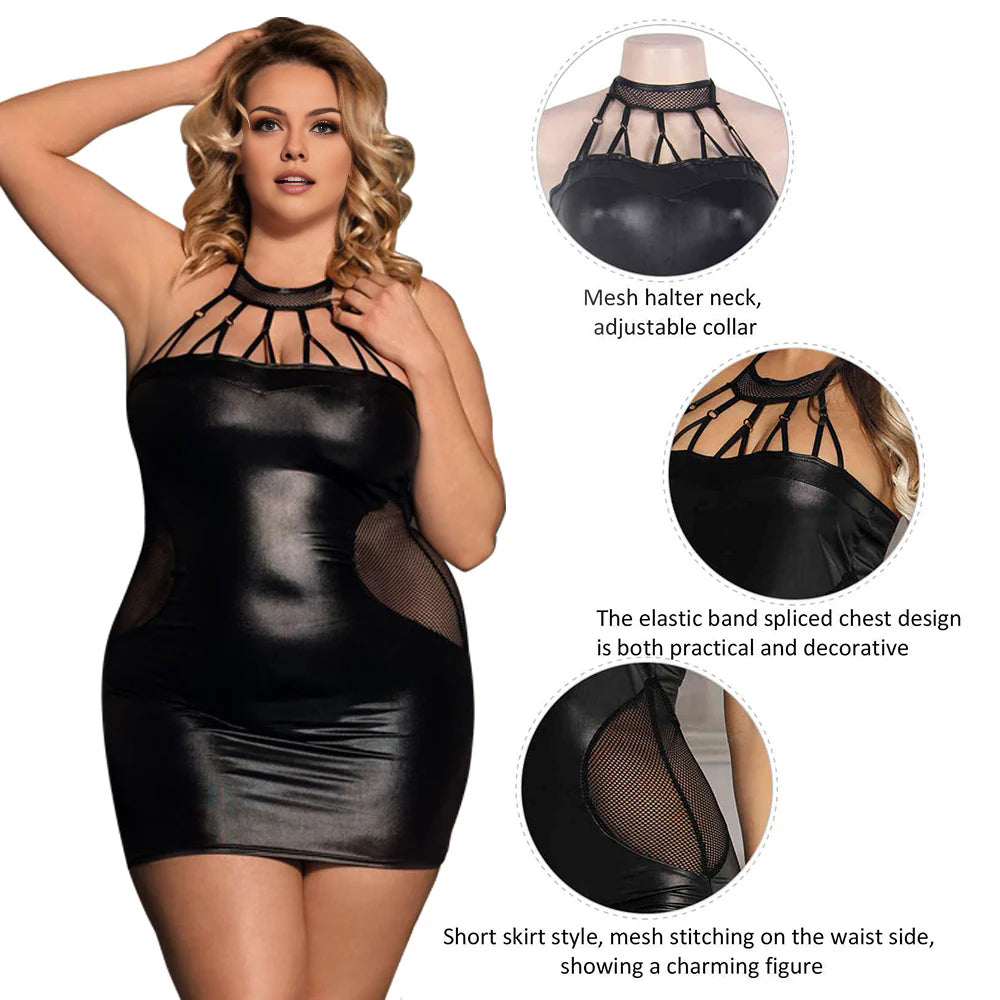 Women Plus Size Black Leather Mesh Panel Babydoll is part of the Plus Size Babydoll collection.The advantage is the lace strapless design and adjustable fit. The lace strapless design adds a touch of elegance to the overall style, while the adjustable fit allows the wearer to customize the piece to their liking. The fit can be adjusted to sit higher or lower on the chest according to the wearer's preference. This feature is especially useful for women who require a specific fit for comfort.