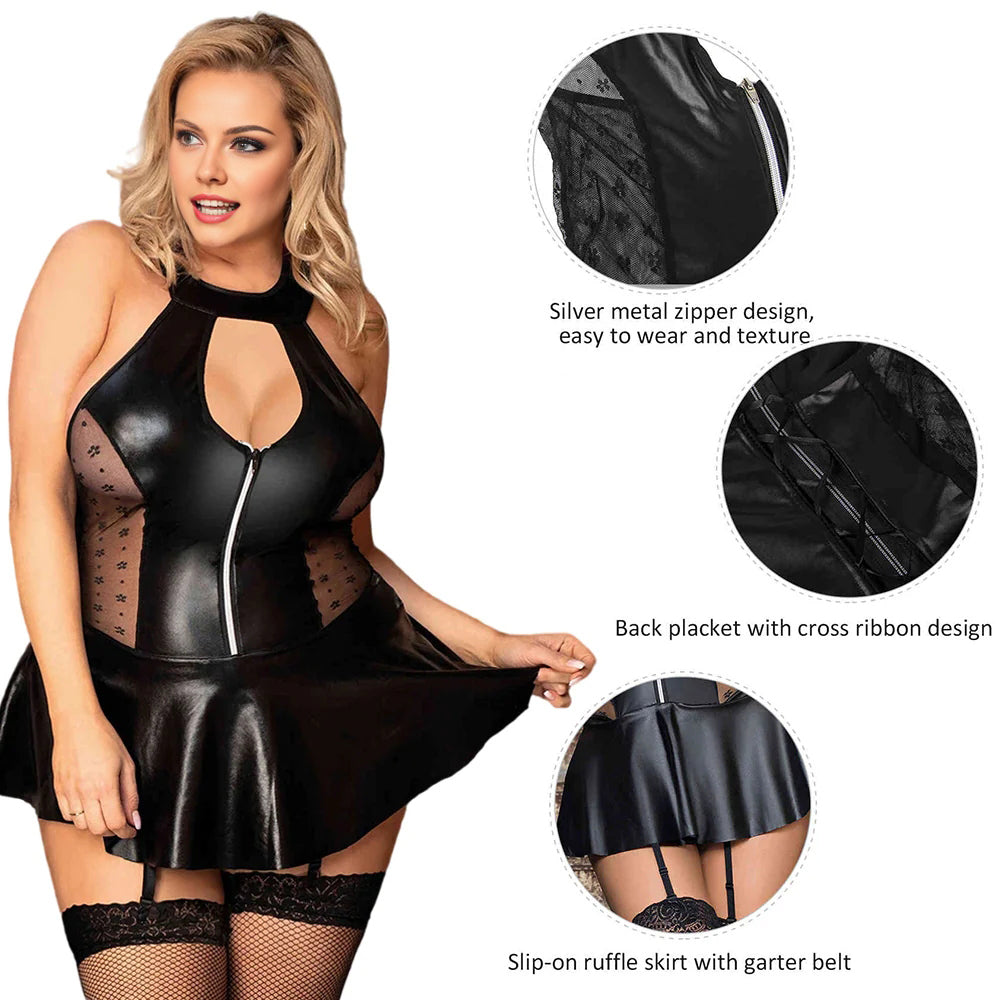Women Plus Size Sexy Halter Leather Gartered Babydoll Not only functional, but stunning. The set includes a short skirt with a ruffled hem and a lace overlay, adding a touch of femininity to the overall look. The dress also comes with detachable garter straps, which means you can layer it with your favorite stockings for an even sexier look.