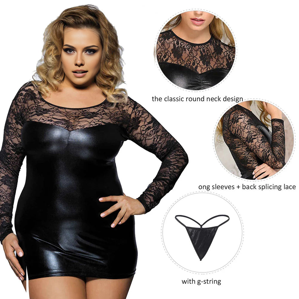 Women Plus Size Leather Lingerie Paneled Lace Babydoll.Introducing the latest addition to the PRUSES collection - the Leather Dress. The perfect blend of classic design and modern sophistication, this dress is a must-have for every fashion-forward woman.