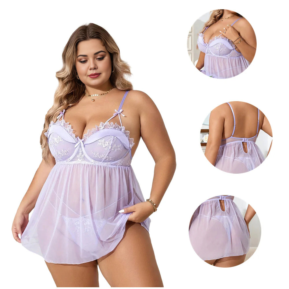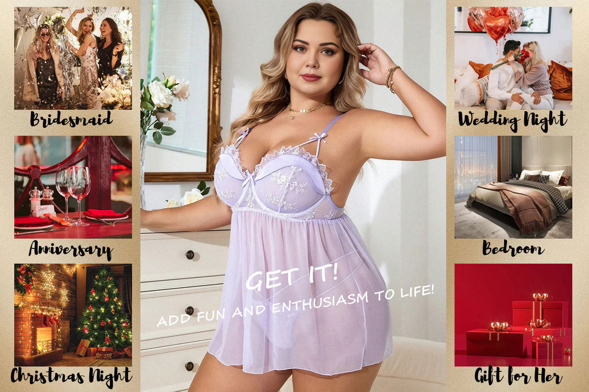 Women Plus Size Sling Lace Sheer Floral Babydoll.One of the features that sets this babydoll apart is the combination of lace and mesh. The mesh fabric adds transparency to the babydoll, making it the perfect choice for a night of passion with your special someone. Additionally, the irregular lace panel design that runs from the front chest down to the hemline adds a playful and cute element to the overall look of the babydoll.