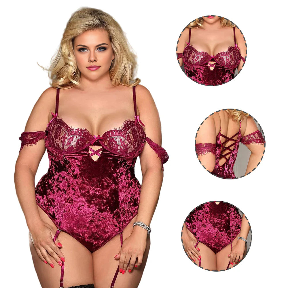 Women Plus Size Charming Purplish Velvet Off Shoulder Teddy.Sexy bodysuit, a product that is as stylish as it is functional. This gorgeous bodysuit has several features that make it stand out from the crowd.