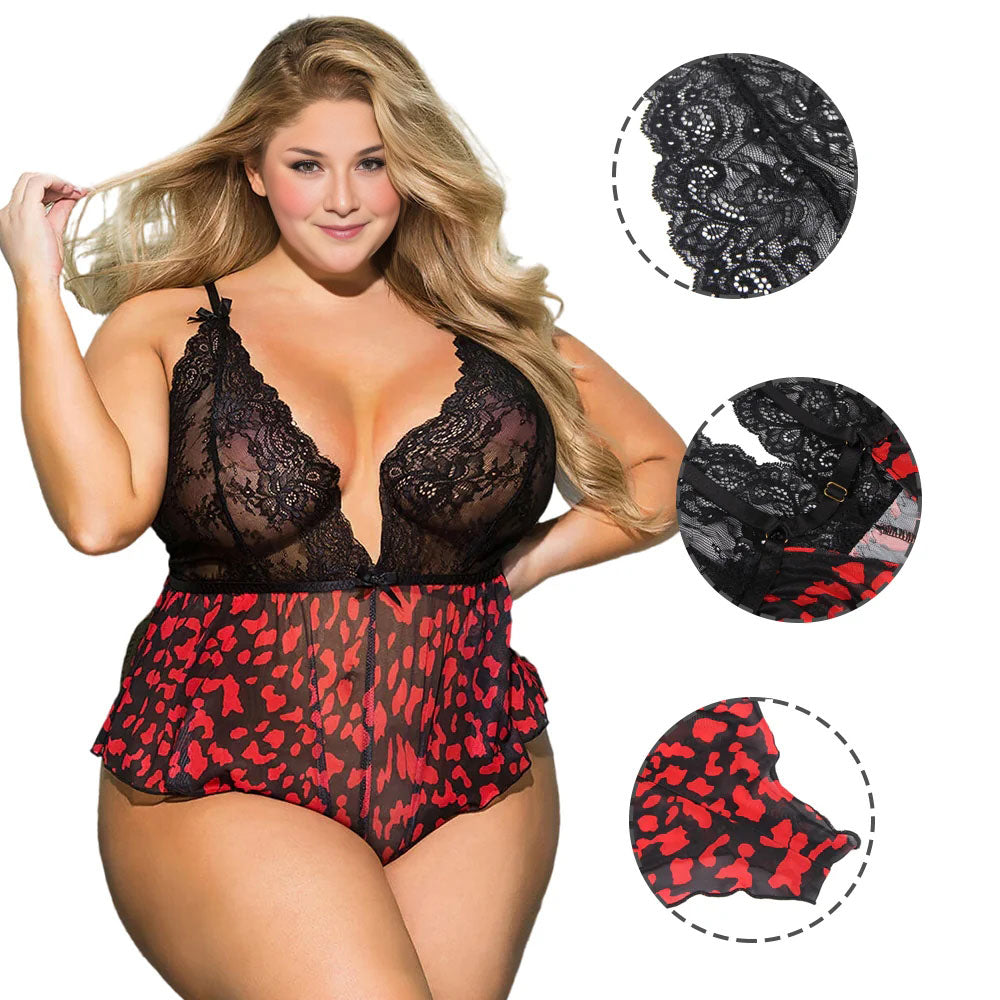 Women Plus Size Floral Lace Pacthwork V Neck Bodysuit The deep V-neck design adds a touch of elegance to the outfit. The combination of lace mesh and printed mesh is a unique design that makes this underwear unique. The adjustable bust ensures a perfect fit for every body shape, and the straps are also adjustable, making it easy to find the perfect fit for your body.