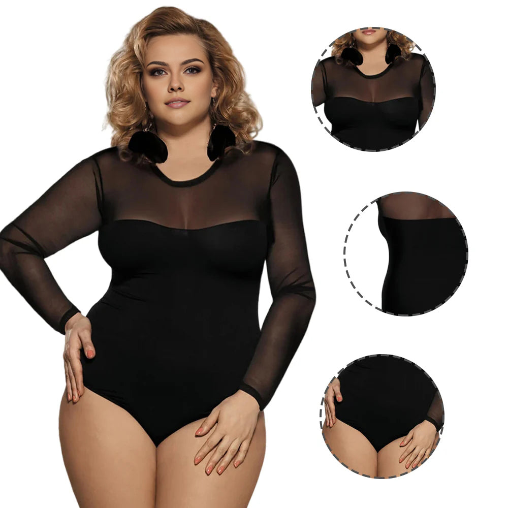 Women Plus Size Black Long Sleeve Bodysuit The bodysuit has delicate lace detailing at the bust, adding a touch of femininity to the garment. The translucent lace material creates a peek-a-boo effect, teasing the viewer's imagination.