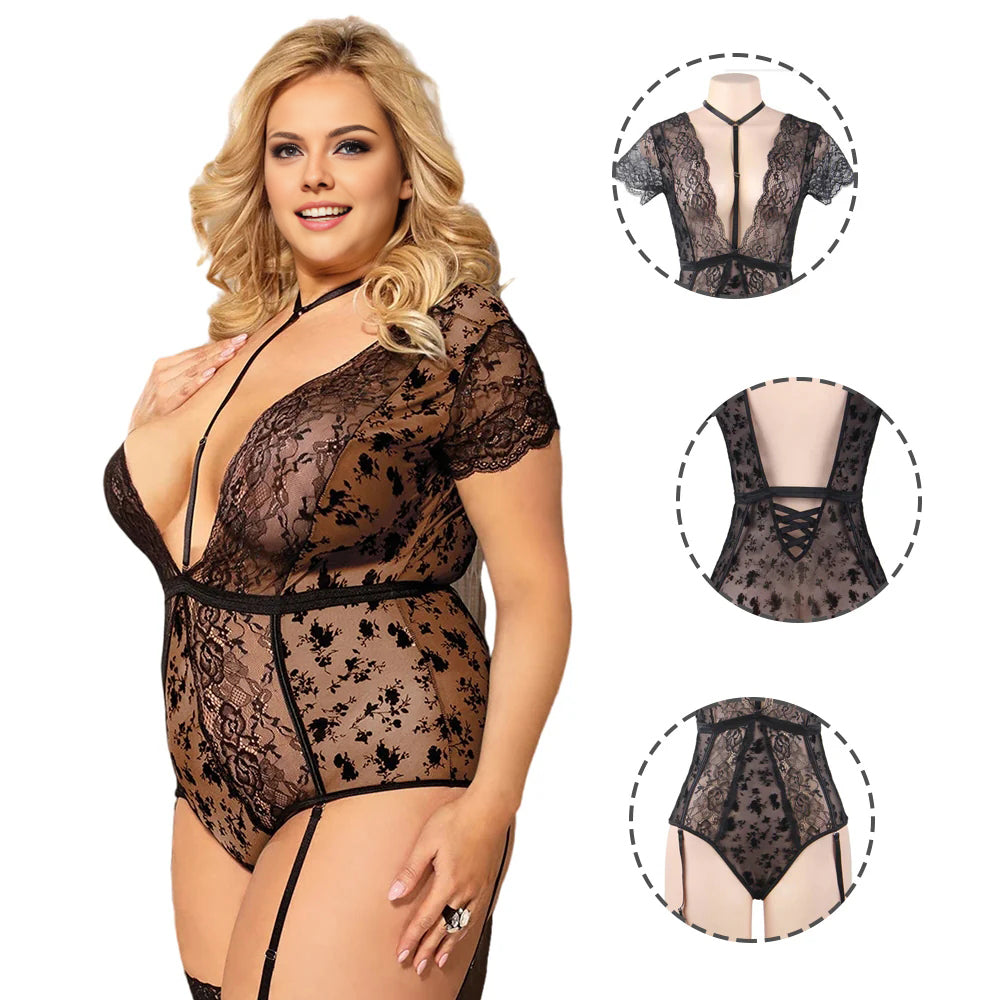 Women Plus Size Lace Short Sleeve Sexy Bodysuit.Plus Size Teddy is made of high-quality fabric that is soft to the touch and has a beautiful color. The plush velvet and lace fabric combination creates a luxurious and elegant look that is perfect for any occasion.