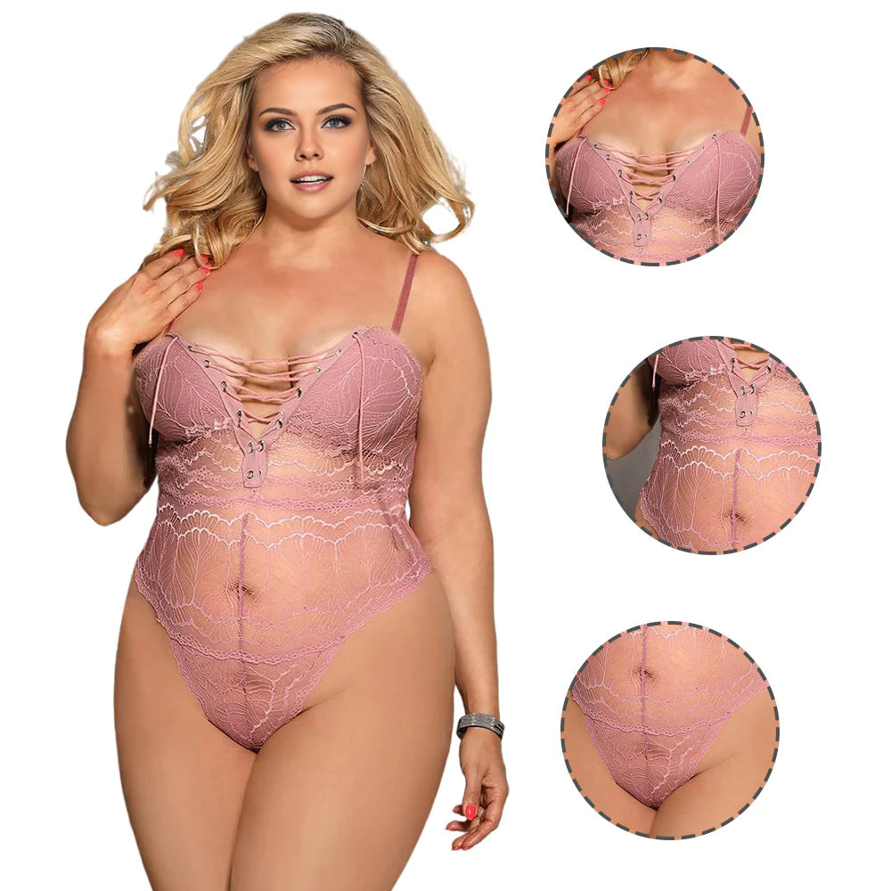 Women Plus Size Pink Lace See Through Teddy Bodysuit.Products that offer comfort and sensuality in a single, elegant design. Made of premium lace mesh fabric, this Teddy underwear ensures breathability and allure, making the wearer feel confident and alluring.
