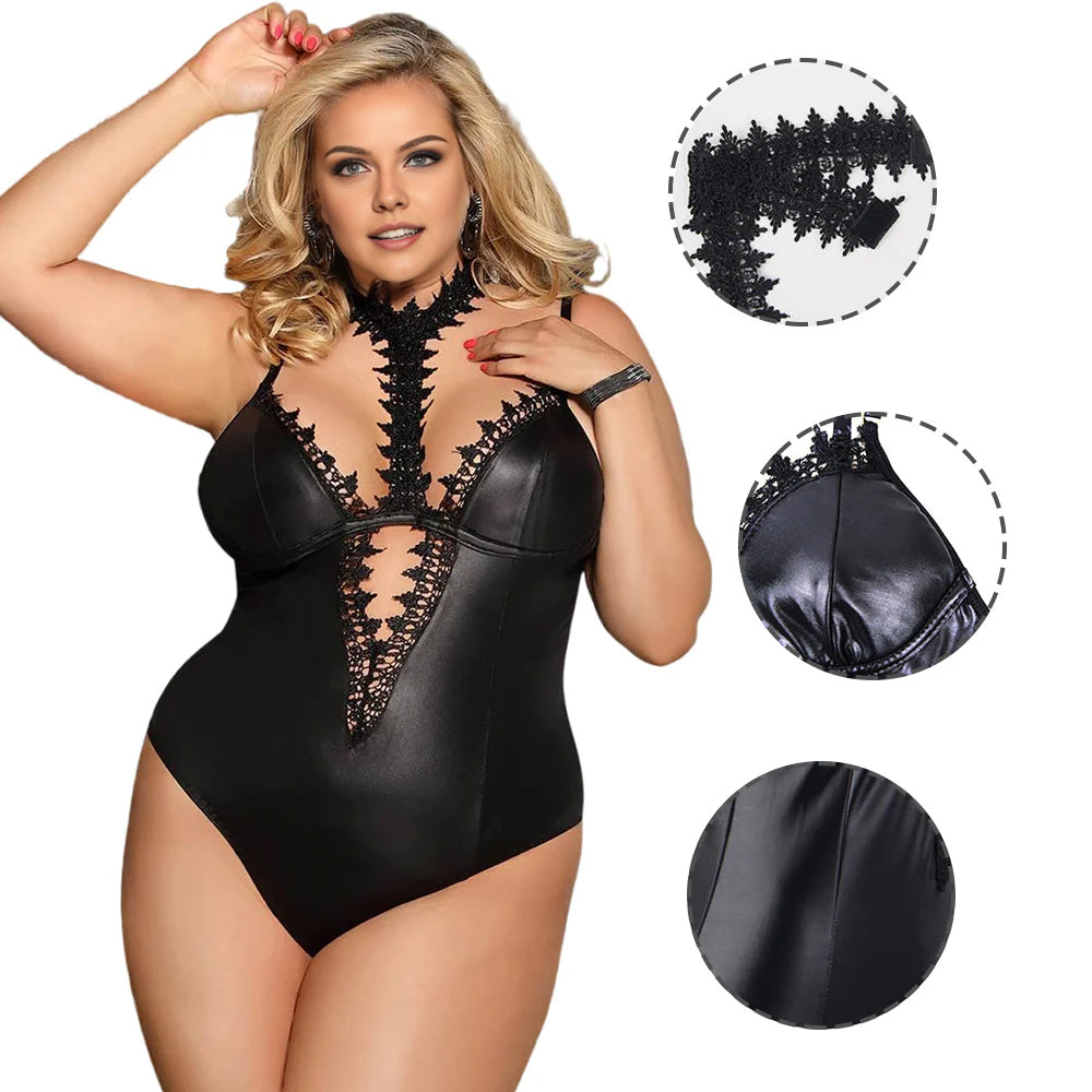 Women Plus Size PU Leather Bodysuit.The neckline, front midband and collar of this lingerie are made of sculptural embroidery lace which adds a chic and high-end look to the lingerie. Lace has a unique texture that enhances the overall charm of underwear.