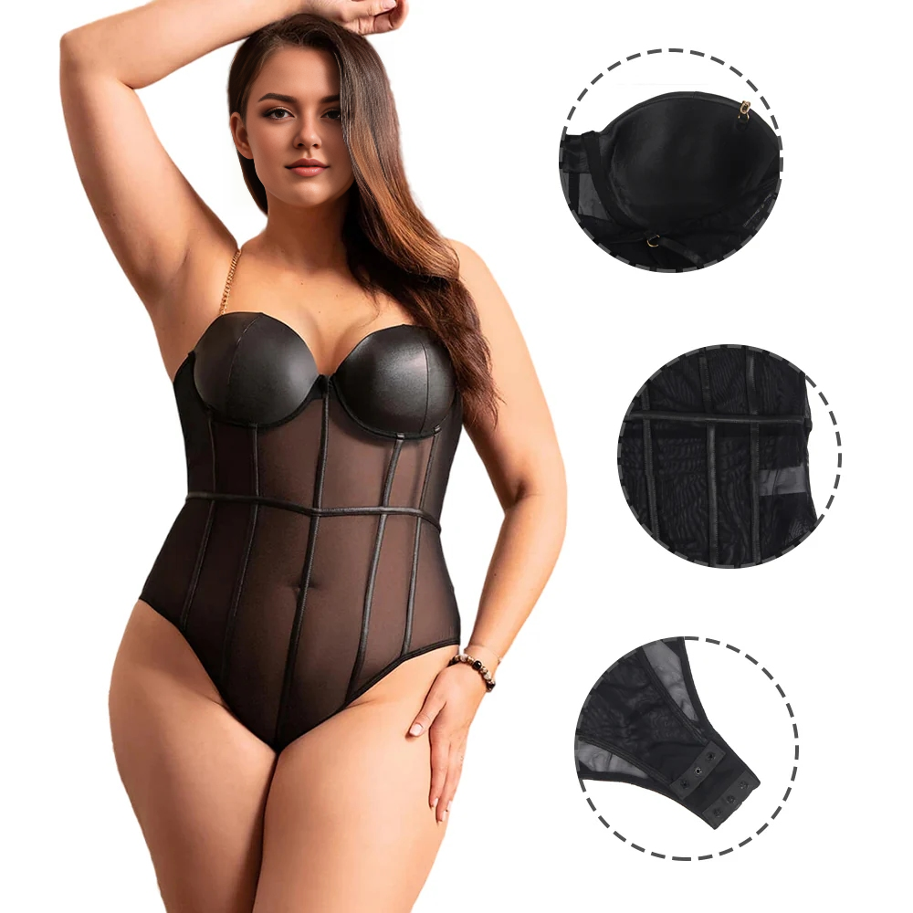 Women Plus Size Sexy Bodysuits Jumpsuits is part of the Plus Size Bodysuit.Bodysuits are a great choice for any woman who wants to enhance her natural beauty with confidence and glamour. Featuring lightweight mesh, padded cups with underwire support, metal chain detailing and a snap closure at the crotch, this bodysuit is the perfect combination of comfort, style and versatility. Available in a variety of sizes, it's the perfect addition to any lingerie collection and is sure to make you feel sexy and confident every time you wear it.