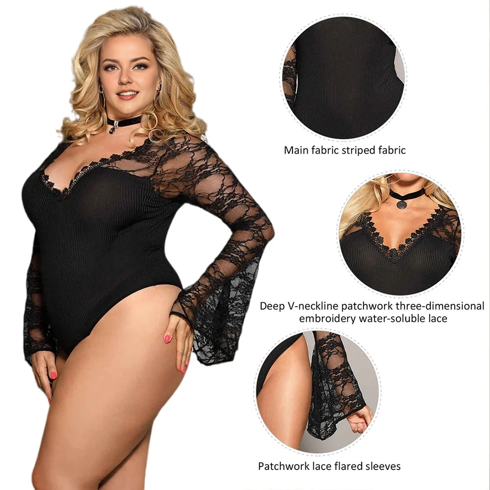 2,Black long-sleeve teddy, v neckline, lace fabric, slim fit bodysuit with horn sleeves, sexy one-piece leotard.