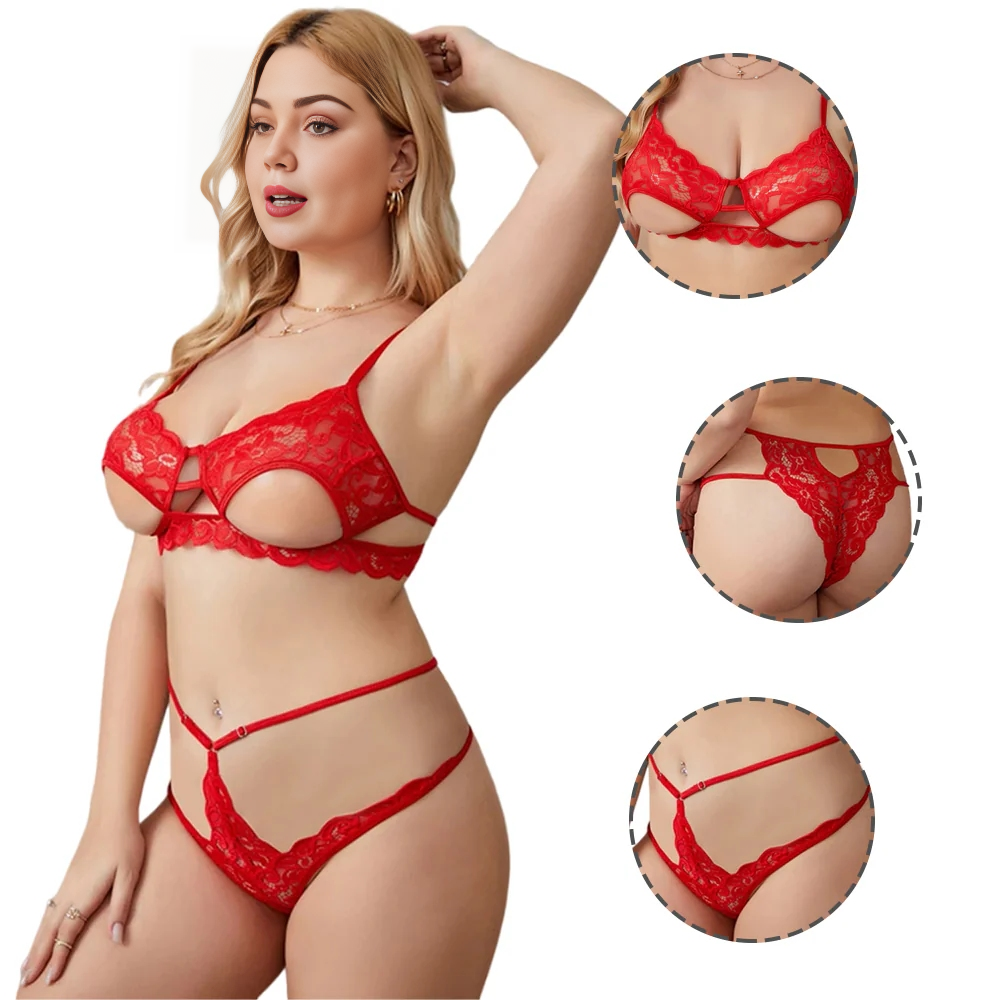 Women Plus Size Lace Embroidery Leakage Sheer Bra Set