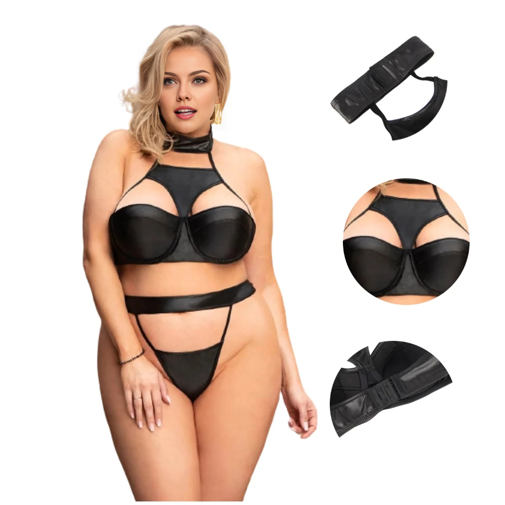Women Plus Size Leather Choker Underwired Bra Set is part of the Plus Size Bra Set. This bra also features a convenient rear closure that makes it easy to adjust and customize the fit. The closure consists of a series of hooks and eyelets that allow you to tighten or loosen the bra when needed for a perfect fit. Additionally, this bra features a unique neck strap that is adjustable with a Velcro buckle. This strap helps keep the bra securely in place even during strenuous activities.