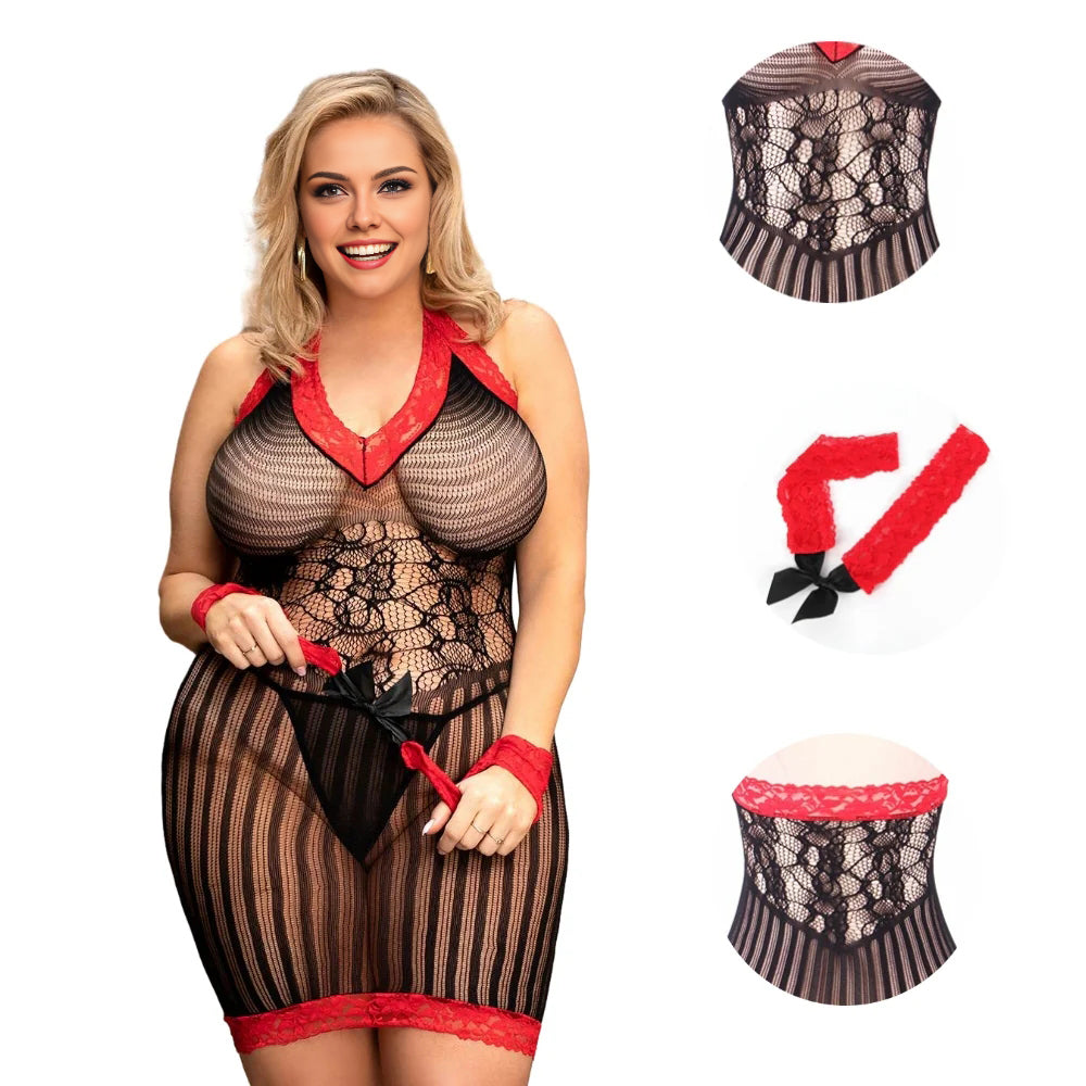Women Plus Size Mesh Cutout Patchwork Petticoat Dress is part of the Plus Size BodyStockings. Stands out from other BodyStockings products with its patterned long sleeves. These patterns add a touch of personality and sophistication, making them a great choice for women who want to add some style to their lingerie collection. Suitable for any occasion. It is a versatile standard product that makes a great addition to any wardrobe.