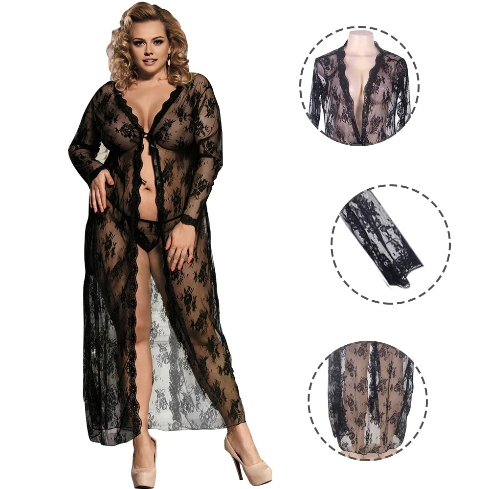 Women Plus Size Floral Lace Gown Sexy Lingerie is part of the Plus Size Robes. A must-have for any woman who wants to add a touch of elegance and sophistication to her wardrobe. Its floral lace fabric, lace details, and long length make it a perfect fit for any pajamas. So if you want to feel and look more confident and attractive, it's the perfect choice for you.