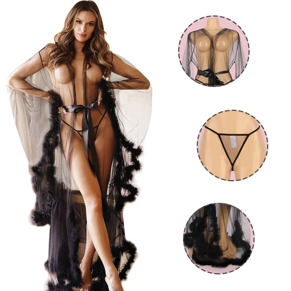 Women Plus Size Sheer Feather Long Robe Nightgown Designed to be both sexy and elegant, this lingerie is the perfect choice for women who want to feel confident and desirable. Sheer mesh combines with plush trim and a maxi skirt for an reveal that's sure to catch the eye. Long sleeves and a waistband add a touch of sophistication to the overall design, making this lingerie ideal for special occasions or romantic evenings.
