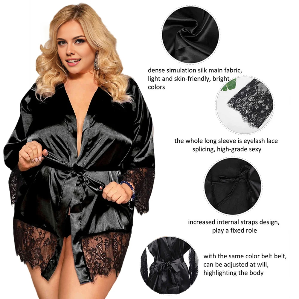 Women Plus Size Floral Lace Robe.is a plus size pajama that is as stylish as it is comfortable. It's available in four different colors - black, red, blue and khaki. The main fabric used in this product is high-quality imitation silk, which is soft, light and skin-friendly. The colors are bright and vibrant, making them a great choice for everyday wear.